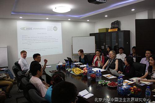 On May 10, 2012, a delegation from London School of Hygiene and Tropical Medicine(LSHTM) visited Peking University China Center for Health Development Studies(CCHDS) and School of Public Health(SPH). The delegation was headed by Dr. Ann Mills, Vice Director for Academic Affairs of LSHTM and Professor of Health Economics and Policy and an intentionally renowned expert in health policy and system research. The other two members of the delegation included Dr. Kara Hanson, Head and Professor of the Department of Global Health and Development and Dr. Carine Ronsmans, Professor at the Department of Infectious Disease Epidemiology, LSHTM. The delegation spoke with Prof. Ke Yang, Executive Vice President of Peking University and Peking University Health Science Center, Prof. Fang Weigang, Vice President of Peking University Health Science Center, Prof. Meng Qingyue, Executive Director of CCHDS and Dean of SPH, and other associate/assistant deans and directors, junior faculty members and students from CCHDS and SPH about strengthening collaboration between LSHTM and PUHSC. CMB consultant Dr. Shufang Zhang, Project Coordinator of United Nations Research Institute for Social Development accompanied the delegation.