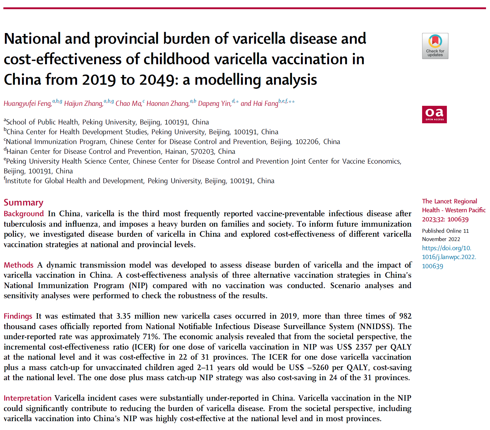 2023年3月,方海教授团队在《The Lancet Regional Health -Western Pacific》在线发表了关于我国全人群水痘的疾病负担和水痘疫苗纳入国家免疫规划经济性研究论文。该研究对于我国未来防控全人群水痘发病和评估水痘疫苗纳入国家和地区免疫规划的财政负担、经济性、可行性提供了重要政策借鉴。北京大学方海教授为共同通讯作者,北京大学公共卫生学院硕士研究生冯黄于飞和博士研究生张海军为共同第一作者。