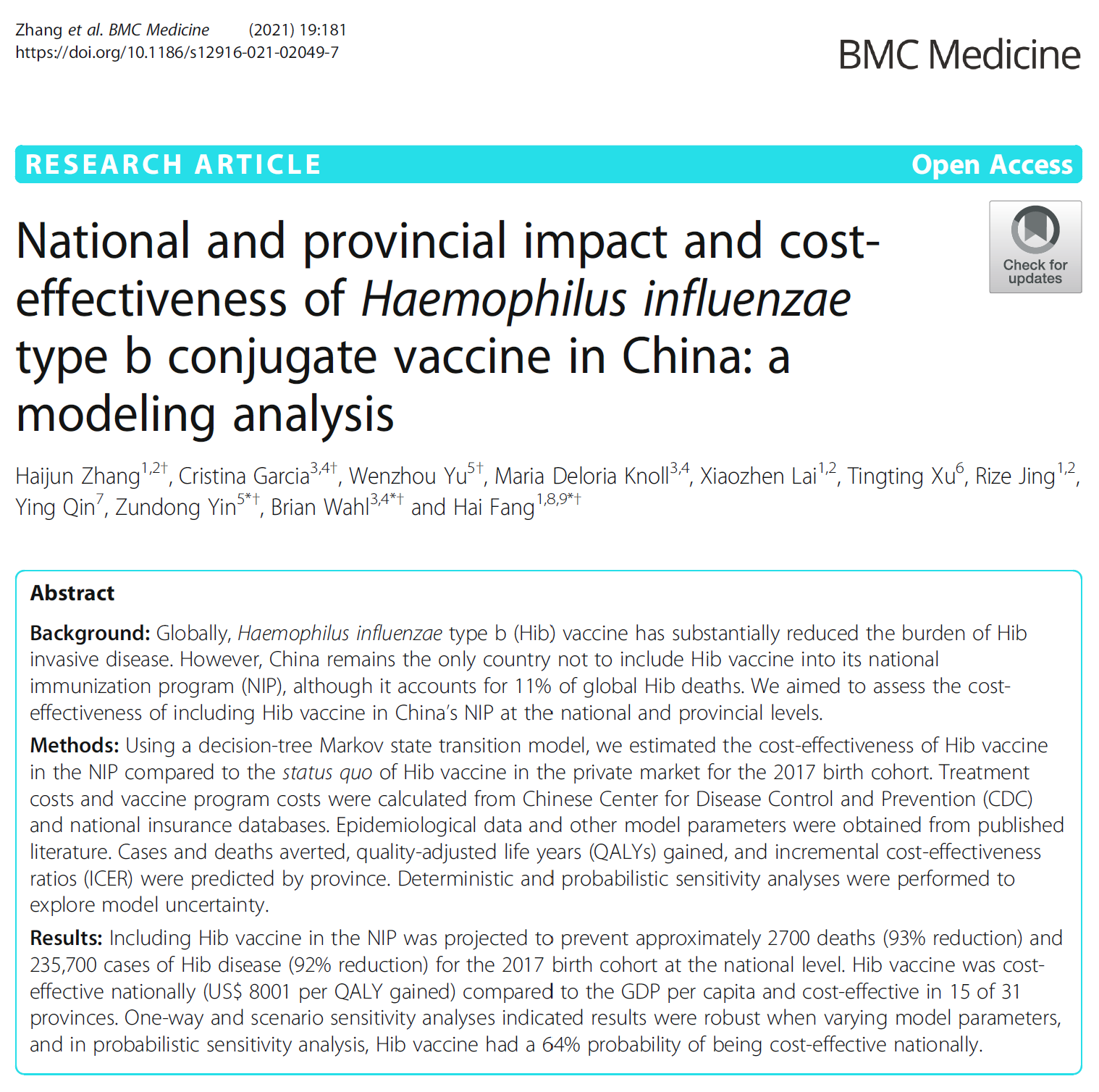 2021年8月,方海教授团队在《BMC Medicine》发表了关于b型流感嗜血杆菌(Hib)结合疫苗纳入我国国家免疫规划的国家级和省级疫苗效果和经济学评价的最新研究。该研究提供了一份关于Hib疫苗的高质量卫生经济学证据,有望促进该疫苗早日纳入免疫规划。北京大学方海教授为共同通讯作者,北京大学公共卫生学院博士研究生张海军为共同第一作者。