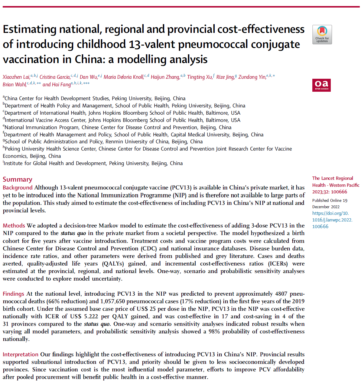 2023年3月,方海教授团队在《The Lancet Regional Health -Western Pacific》发表了中国儿童13价肺炎球菌结合疫苗(PCV13)纳入免疫规划的经济学评价研究。研究结果突出了将PCV13纳入中国国家和省级免疫规划中的成本效益,建议优先考虑社会经济欠发达省份,并通过集中采购进一步提高PCV的可负担性,对有效降低我国儿童肺炎链球菌疾病负担,促进健康公平具有重要意义。北京大学方海教授为共同通讯作者,北京大学公共卫生学院博士研究生来晓真为共同第一作者。
