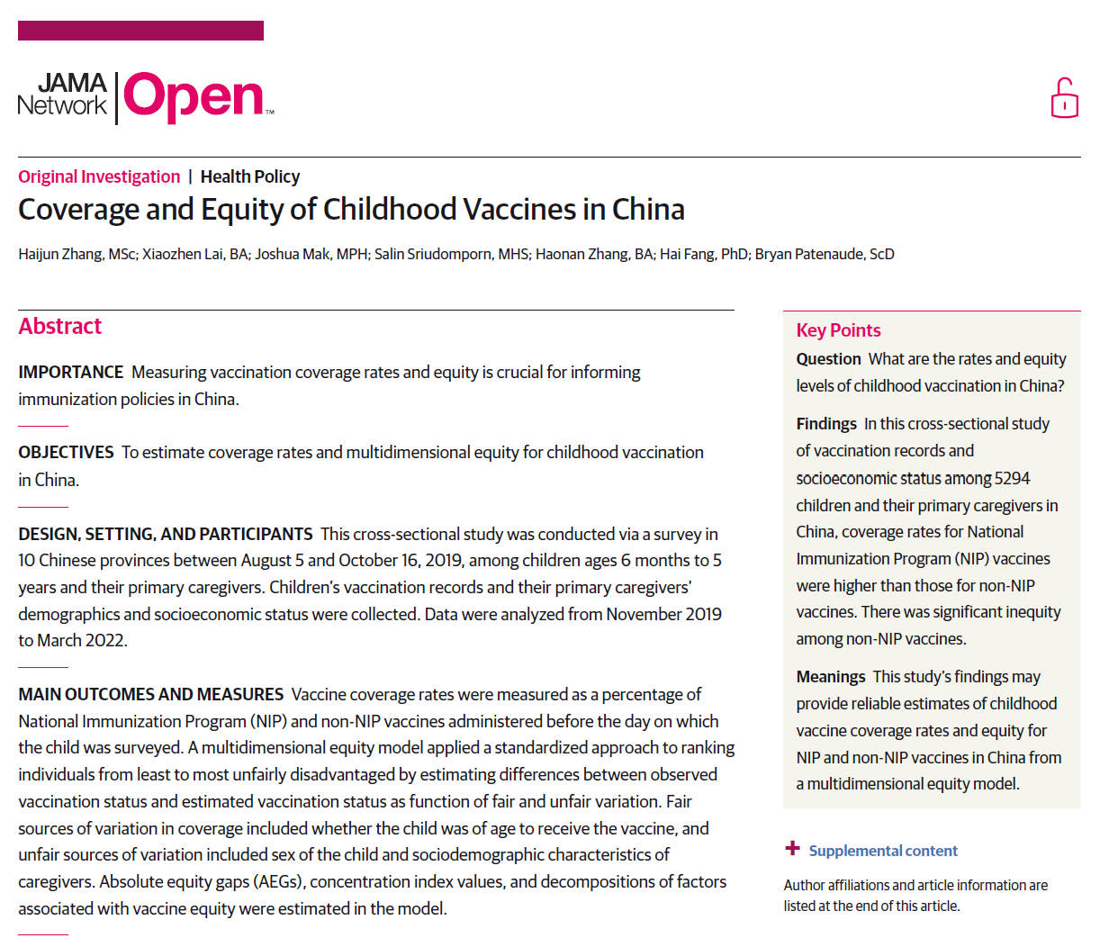 2022年12月,方海教授团队在《JAMA Network Open》在线发表了关于我国儿童疫苗接种率和公平性研究。监测疫苗接种率和公平性一直都是我国免疫规划政策的重要内容,尤其是对于非免疫规划疫苗。该研究估计了中国主要儿童疫苗的接种率,并测算了多维度的接种公平性。研究发现,中国在儿童免疫规划方面取得了巨大成就,疫苗接种率保持在非常高的水平,公平性也不断提高。北京大学方海教授为通讯作者,北京大学公共卫生学院博士研究生张海军为第一作者。