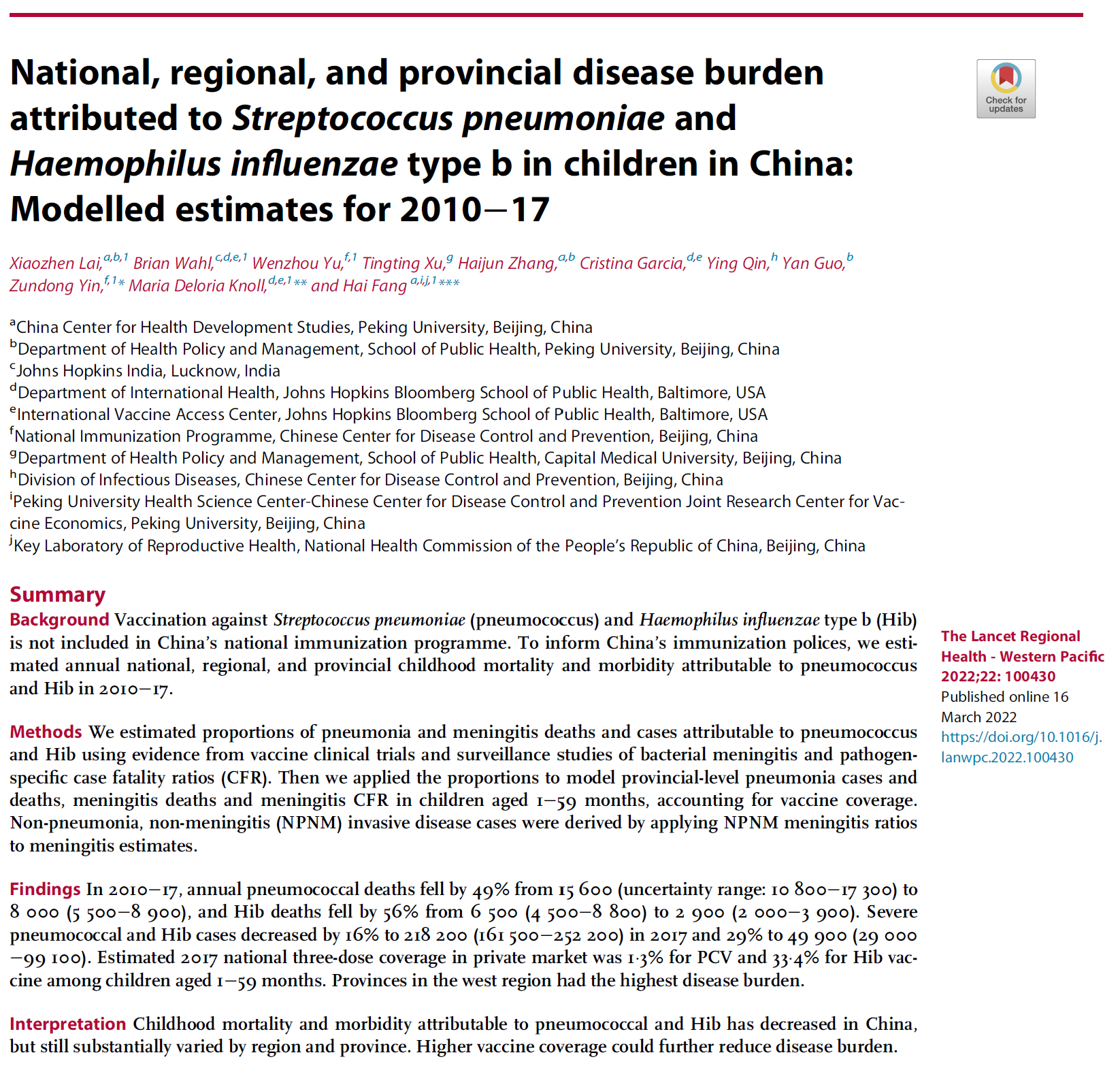 2022年5月,方海教授团队在《The Lancet Regional Health -Western Pacific》发表了中国儿童肺炎链球菌和b型流感嗜血杆菌(Hib)疾病负担研究,应用数学模型测算了我国大陆地区31个省、市、自治区5岁以下儿童的肺炎链球菌及Hib相关疾病的负担情况。根据模型测算结果,2010-2017年我国肺炎链球菌相关重症及死亡病例减少了16%和49%,Hib相关重症及死亡病例减少了29%和56%,整体发病率和死亡率均有显著下降。同时,该研究作为我国第一项测算了分地区、分省的肺炎链球菌及Hib相关疾病负担的研究,也指出了我国肺炎链球菌及Hib相关疾病死亡率存在的明显的地域不平衡现象。北京大学方海教授为共同通讯作者,北京大学公共卫生学院博士研究生来晓真为共同第一作者。