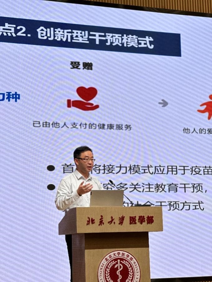 论坛下半场由中国卫生发展研究中心方海教授主持。来自南京医科大学的吴丹教授就2022年作为第一作者发表在Lancet Infectious Diseases的重要研究成果“Effectiveness of a pay-it-forward intervention compared with user-paid vaccination to improve influenza vaccine uptake and community engagement among children and older adults in China: a quasi-experimental pragmatic trial”进行了汇报,该研究观察了在当前疫苗接种认知与需求不足、政府财政支持不足以及社区倡导活动数量、质量欠佳的背景下,一种创新接种模式“接力种”对流感疫苗接种的促进作用。吴丹教授就研究前期准备、实验设计等方面进行了详细介绍。报告结束后,西安交通大学药学院副院长方宇教授从研究立意、研究创新性的行为干预模式、研究设计以及研究的应用价值四个方面对报告进行了精彩点评。
