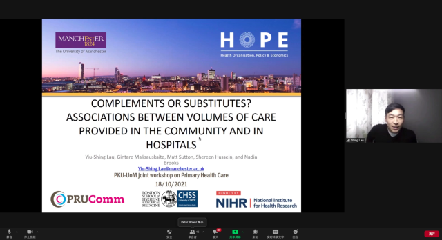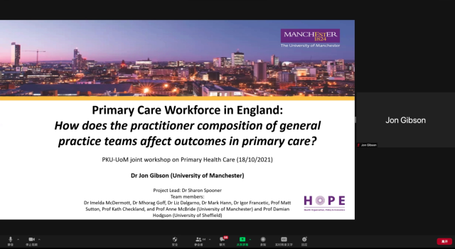 2021年10月18日,北京大学中国卫生发展研究中心(简称“中心”)与曼彻斯特大学基层卫生与卫生服务研究中心联合举办基层卫生研讨会。两校40余名师生,以及来自英国帝国理工大学、约克大学、华威大学,加拿大麦吉尔大学、多伦多大学,我国山东大学、清华大学、中山大学、上海交通大学、浙江大学、中国财政科学研究院等学术机构的40余名专业学者连线,就中英基层卫生服务体系改革与发展的前沿问题开展了深入讨论。本研讨会由北京大学国际战略合作伙伴基金资助。研讨会由中心助理教授马晓晨博士主持。