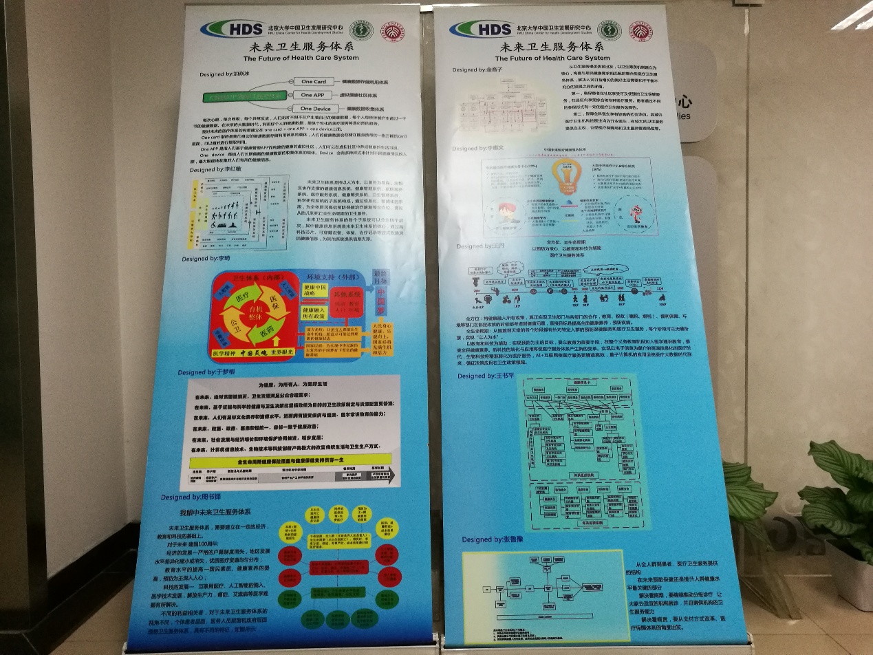 会议准备期间,北京大学中国卫生发展研究中心专门组织了十位卫生体系研究方向的研究生围绕“未来理想中我国卫生服务体系展望”为主题进行了方案征集。会上集中展示了所征集的未来卫生服务体系方案。同学们结合专业及兴趣的大胆想象吸引了到场领导和专家的目光并获得好评。