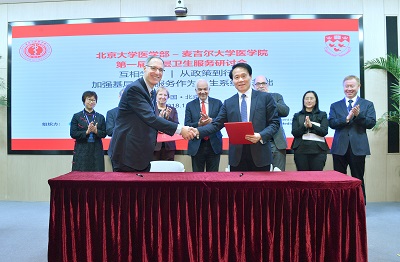 北京大学常务副校长、北京大学医学部主任詹启敏院士在研讨会开幕式上指出,当前是我国健康事业发展最好的时代,我国政府把人民健康放在优先发展的战略地位,重视强化基层卫生建设,推动健康中国2030战略规划目标的实现。北京大学医学部在过去100年中对医学教育做出了重要贡献,近年来还专门设立全科医学系,培养全科医生。北京大学在努力建设世界一流大学和世界一流学科,高度重视与高水平国际院校的交流合作工作。加拿大驻华大使John McCallum在致辞中指出,中加两国友谊源远流长,当前是中加深入合作的最佳历史时期。健康和医学领域的合作是两国合作尤其是民间交往的重要领域。麦吉尔大学和北京大学在医学及相关学科方面代表中加两国领先水平,两校合作有着重要意义。加拿大麦吉尔大学副校长Martha Crago代表麦吉尔大学表达了对进一步加强两校合作的期待,并提出在蒙特利尔举办下一届联合研讨会。两校领导共同签署了北京大学医学部与麦吉尔大学医学院合作备忘录。随后,中加双方学者就从国际比较、卫生服务需求和利用、服务体系构建、人才队伍建设等视角对中加两国的基层卫生服务现状、挑战及发展路径展开了深入的交流。