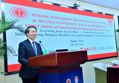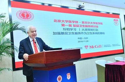 2018年11月20日,北京大学医学部联合麦吉尔大学医学院第一届基层卫生服务研讨会在北京大学医学部成功举办。会议的主题是:“互相学习:从政策到行动——加强基层卫生服务作为卫生系统的基础”。本次研讨会由北京大学医学部和麦吉尔大学医学院联合举办,北京大学中国卫生发展研究中心承办。加拿大驻华大使John McCallum出席活动并致辞。来自国家卫健委、世界卫生组织、世界银行、美国中华医学基金会和全国11个省市的知名医学院校专家学者等共计100余人应邀参加了会议。开幕式由北京大学医学部国际合作处处长孙秋丹主持。