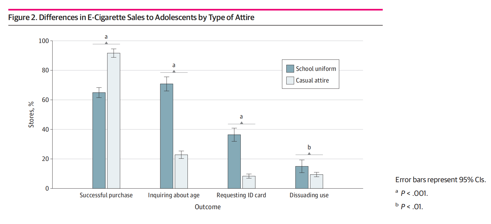 近年来,电子烟因口味丰富、营销吸引等特点,使用率在青少年群体中持续上升。我国 2021 年监测数据显示,16.1%的初高中学生曾尝试过电子烟。电子烟危害青少年健康,还可能使其接触传统香烟,加剧多烟草产品使用风险。我国《未成年人保护法》明确禁止向18岁以下未成年人销售电子烟与香烟,并要求商家核查购买者身份证件,但此前电子烟市场监管起步较晚,部分商家对年龄限制政策的执行存在漏洞,未成年人获取电子烟的问题仍需重点关注。在此背景下,该研究探索通过 “校服视觉信号” 干预商家销售行为,为阻断青少年电子烟获取渠道提供了新视角。