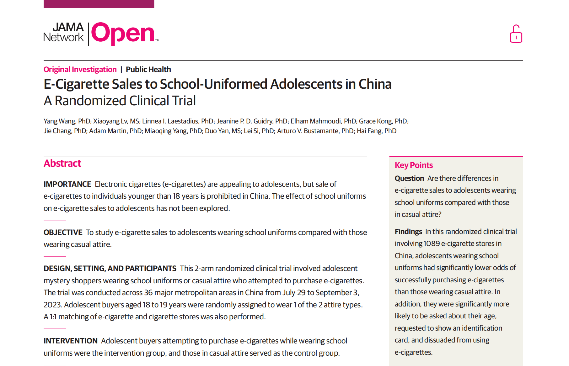 2025年10月10日,北京大学方海教授和澳门城市大学汪洋副教授(原北京大学副研究员)合作研究成果《中国面向穿校服青少年的电子烟销售情况:一项随机对照试验》在《JAMA Network Open》杂志发表。该研究首次聚焦校服对我国青少年电子烟购买行为的影响,证实穿校服可显著降低青少年成功购买电子烟的概率,为我国未成年人控烟工作提供了重要的循证依据与实践方向。