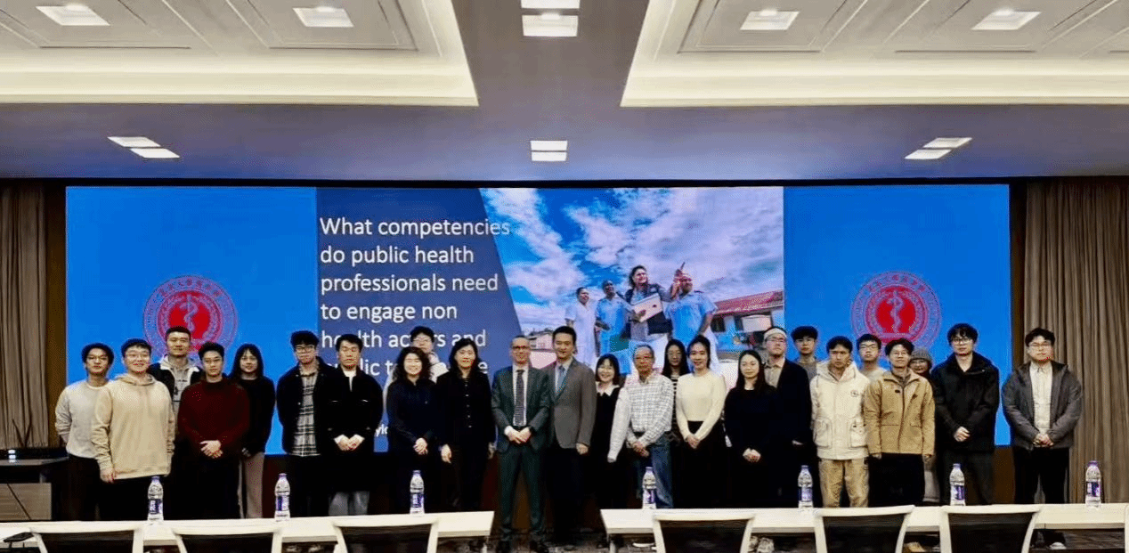马丁发表了题为“公共卫生专业人员需要哪些能力来促进与非卫生部门及公众的互动以改善健康?(What competencies do public health professionals need to engage non health actors and the public to improve health?)”的特邀报告。他深入剖析了全球健康领域面临的挑战。马丁指出,联合国可持续发展目标中的健康相关指标进展缓慢,传染病负担持续存在、非传染性疾病日益突出、人畜共患病风险加剧,全球卫生系统在服务可及性和财务保护方面仍面临重大挑战。气候变化、地缘政治动荡和经济压力等多重复杂因素,不健康食品的推广、烟草酒精消费以及网络攻击和错误信息等新兴威胁,都对公共卫生工作提出了新的要求。在此背景下,公共卫生专业人员需要突破传统工作领域,积极开展跨部门合作。
