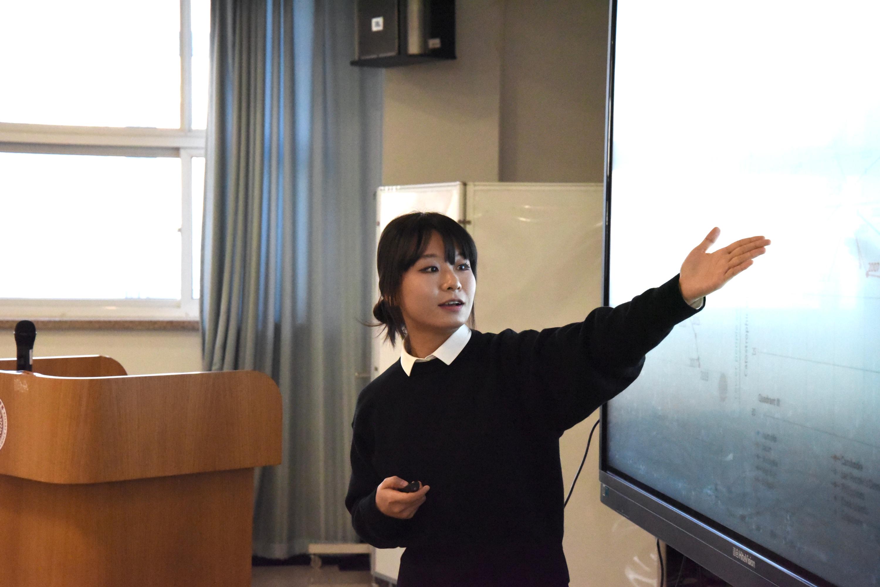 北京大学中国卫生发展研究中心田宜冉同学作为学生代表进行了汇报,田宜冉同学分享了自己参与全民健康覆盖项目的心得体会和经历,从参与者的角度介绍了负责部分的研究产出。